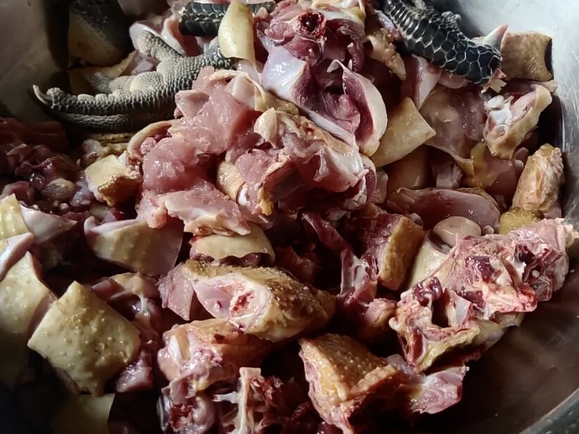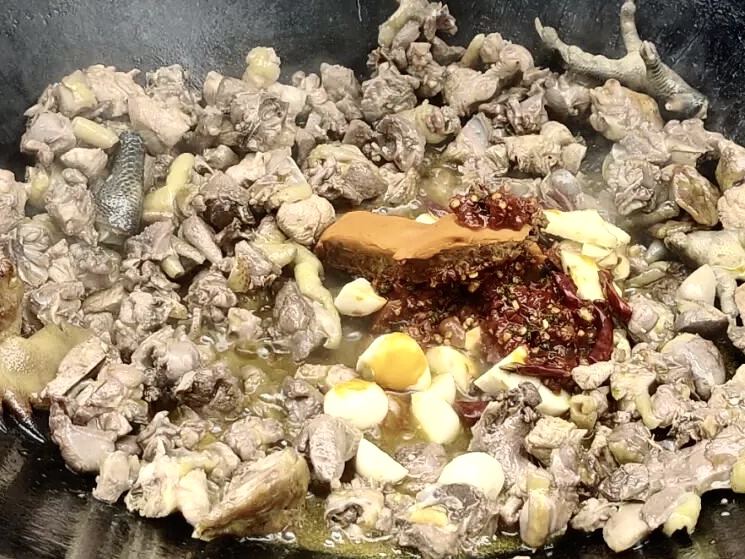 准备好热水,先把公鸡的羽毛拔掉,随着羽毛的脱落,公鸡渐渐露出了它那紧实的皮肤。拔完羽毛后,开始清理内脏。小心翼翼地剪开鸡肚,把内脏一一取出。然后,把鸡切成小块,准备下锅烹饪。我们在院子里生起火,在大铁锅里倒入菜籽油。等油热了,把切好的鸡块放入锅中煸炒。鸡块在锅里发出“滋滋” 的声响,继续不停地翻炒着鸡块,让它们均匀地受热。
