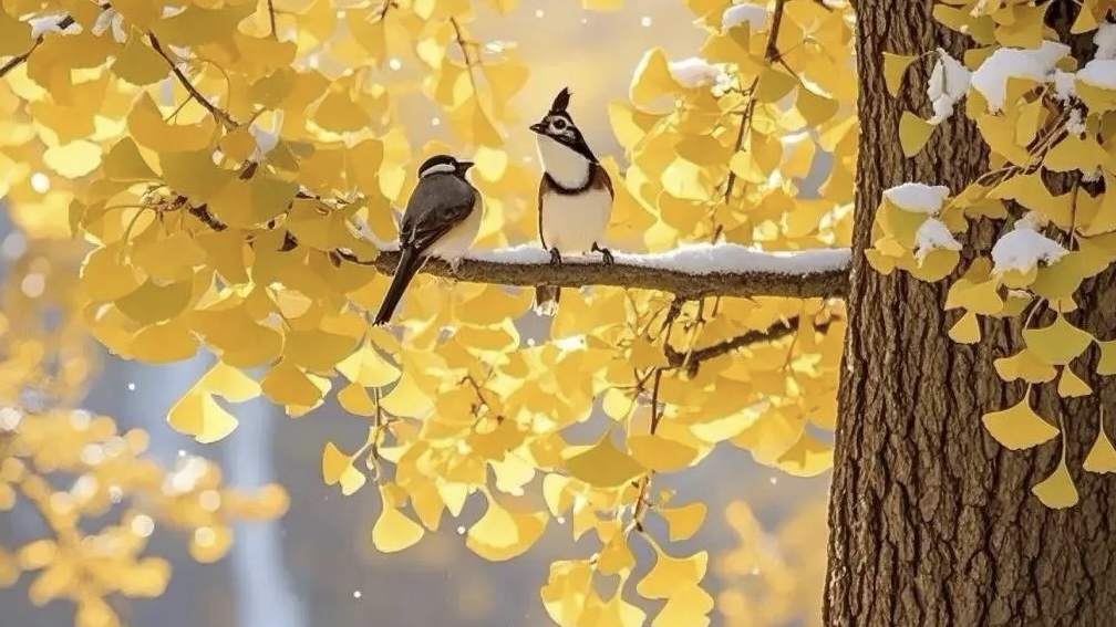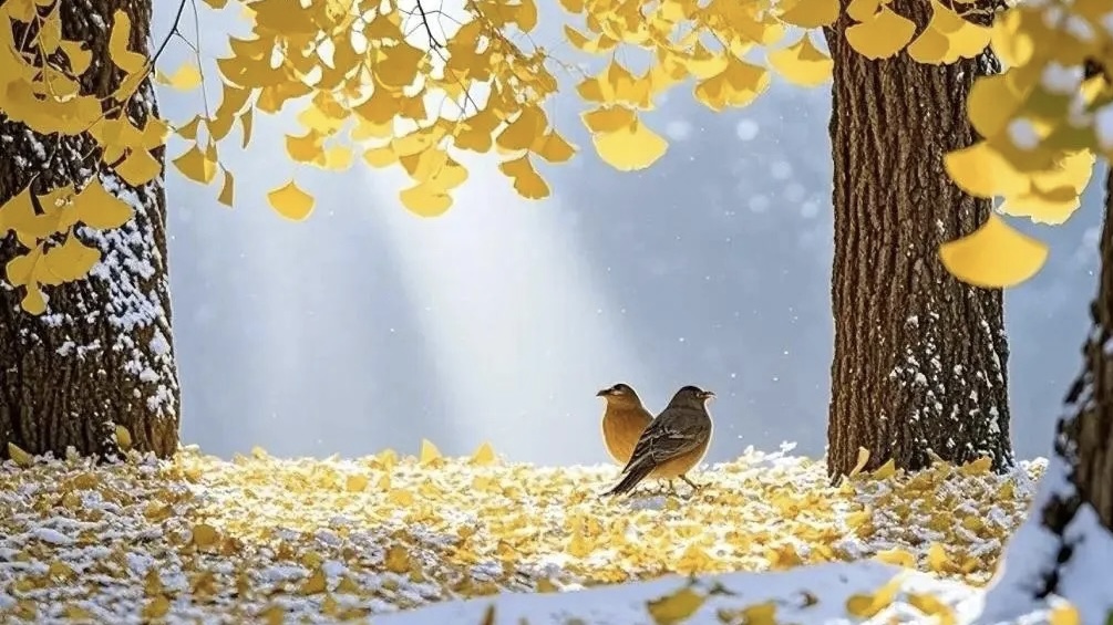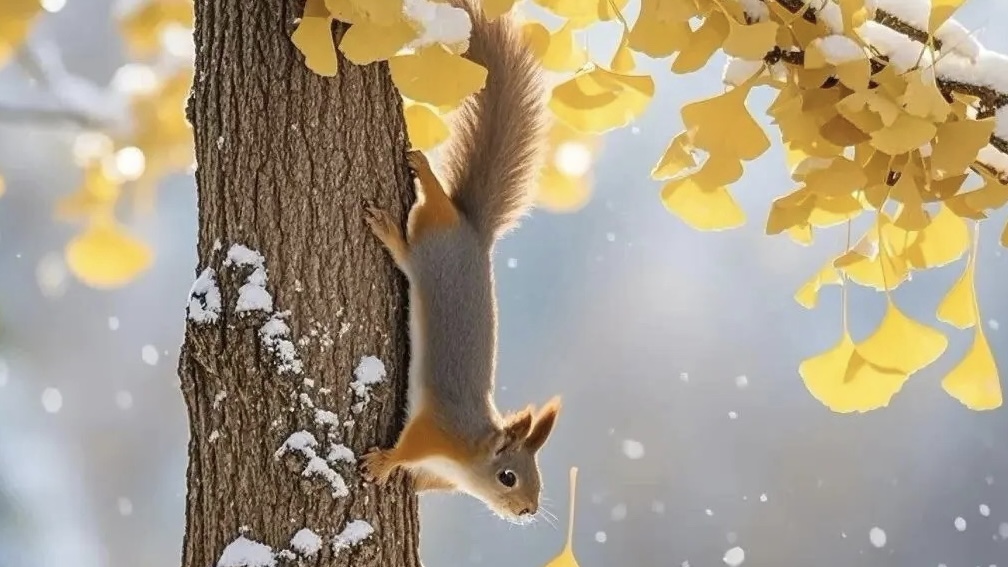 这首“初冬的雪”通过“银杏树”“泛黄”与“银色”的对比,形成秋末与初冬“鸟雀”“松鼠”等动态意象的加入,使静态雪景产生生命律动,如“松鼠红着脸褪了醉意”拟人化手法赋予动物人性化的羞涩,与“鸟雀”喃喃细语“松鼠”等生物与雪的互动,构成微型生态。