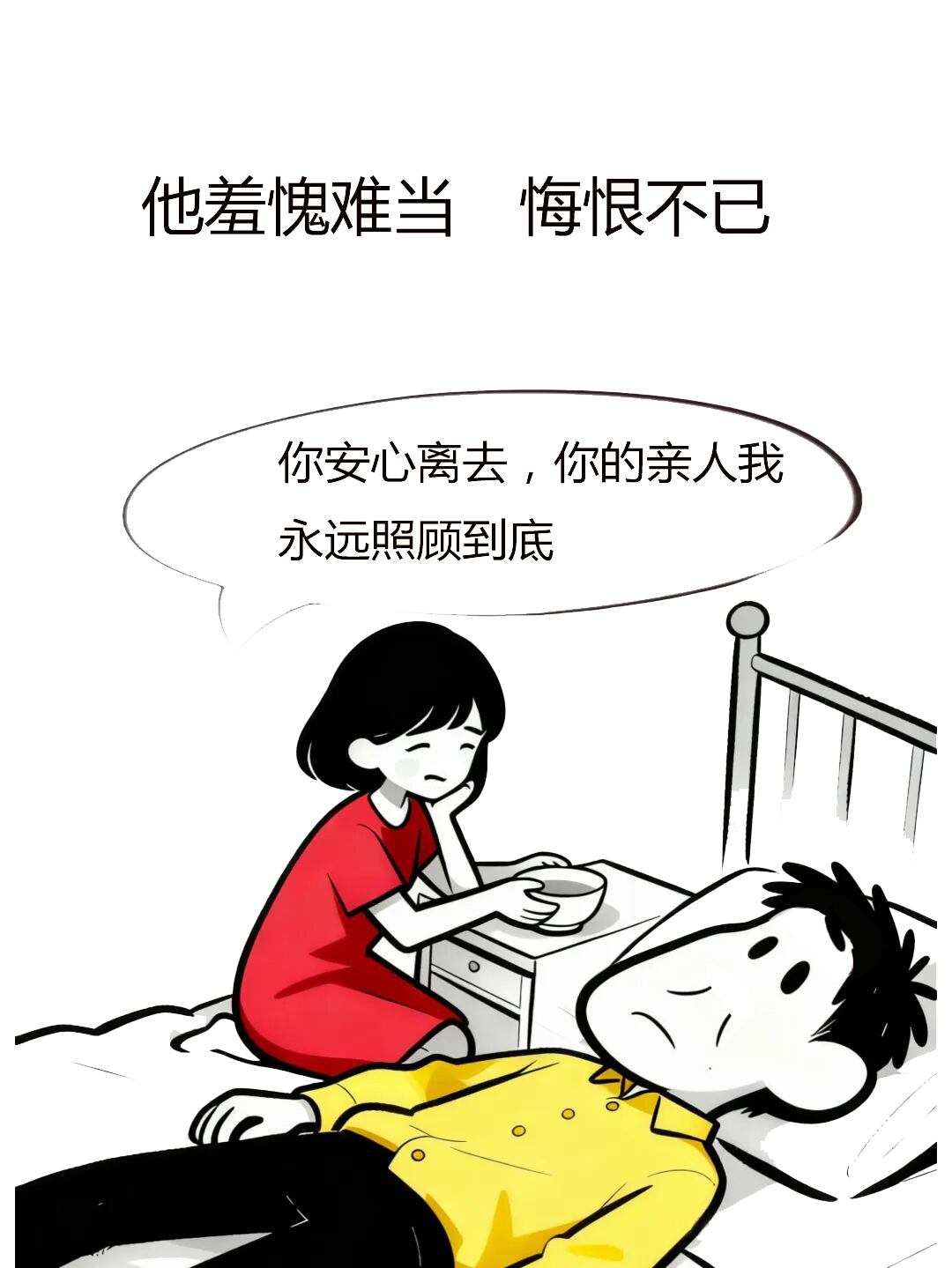 病榻上,人脱相,面如栗,妻鼻酸泪涕,愤悯唠絮,他愧疚难当,悔恨不已。弥留之际,其言悲戚:“感谢这些年你一直照顾我娘和我傻弟,如有来生,还要娶你为妻!”,“你私吞的300万,我已上交审计,不义之财,害人害己,你安心离去,你的亲人我永远照顾到底。”。