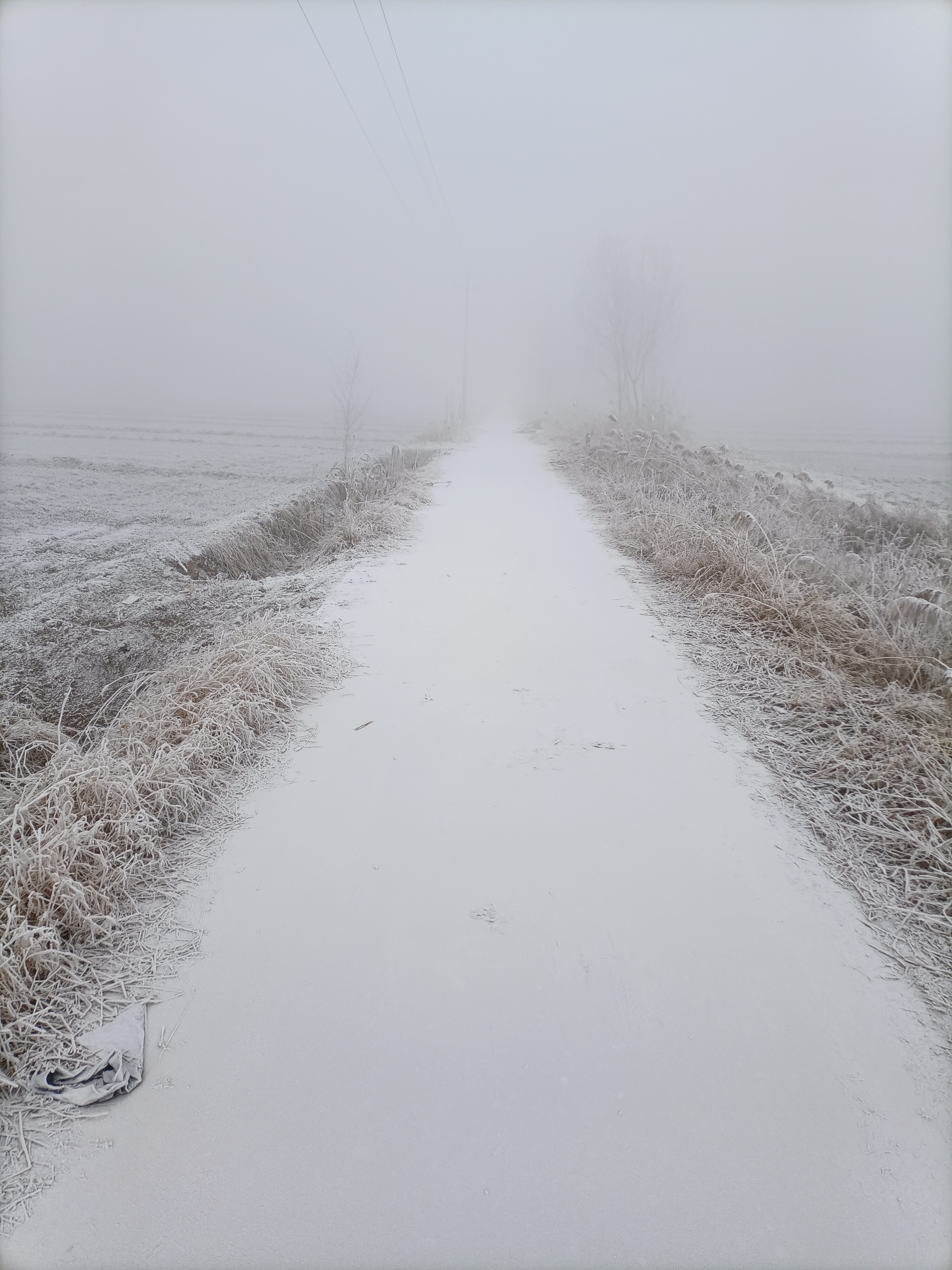 我伴着均匀的呼吸前行,寒冽的空气钻进鼻腔,呼出的白气在喉间凝成一缕暖雾,又转瞬便被浓稠的雾霭吞噬。肩头、发梢、眉睫,渐渐覆上一层薄薄的白霜,整个人像被裹进了冷白色的雾团里,与这片乡野融为一体。路旁的芦苇絮在寒风中簌簌摇曳,那细碎的晃动,是旷野里唯一的动态,把控的周围愈发寂静。