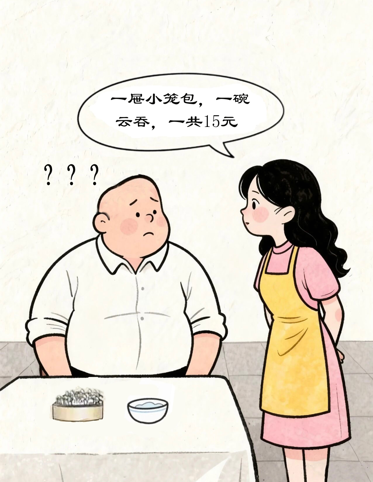今天是老钱退休后第一天,当他来到餐馆时,发现老贾不在,换了一个小姑娘。没有多想,他依旧坐在了原来的位置,本以为云吞和小笼包会马上端上来,但恰恰相反,小姑娘根本没理他。他喊到:“云吞一碗,小笼包三个。”,小姑娘走过来,说:“小笼包三个不卖,要一屉,外加一碗云吞,一共15元,先交钱。”。