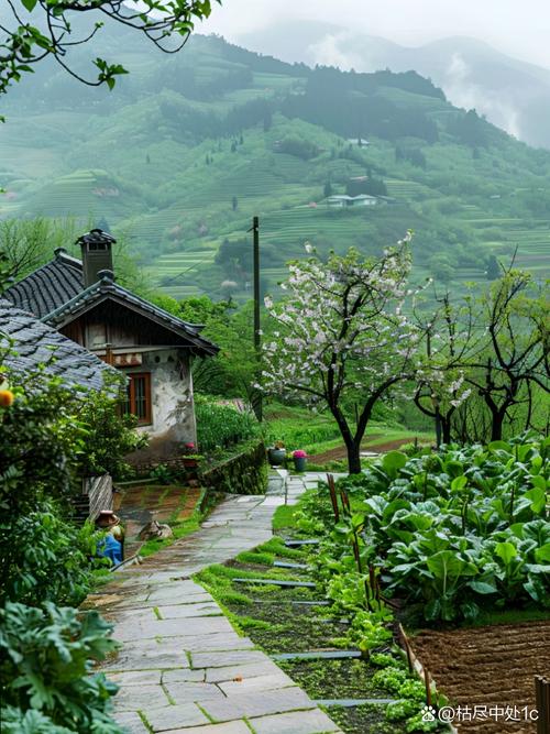 说话间到了岔路口,他往北去,我则继续向南而行。看着他远去的背影,我心里感慨,这世上谁不恋家呢?我一人一车,扎进雨幕里,不慌不忙地前行。雨丝沙沙打在雨披上,远处的房屋、树木朦朦胧胧,多了一层被雨水滋润的烟火气。